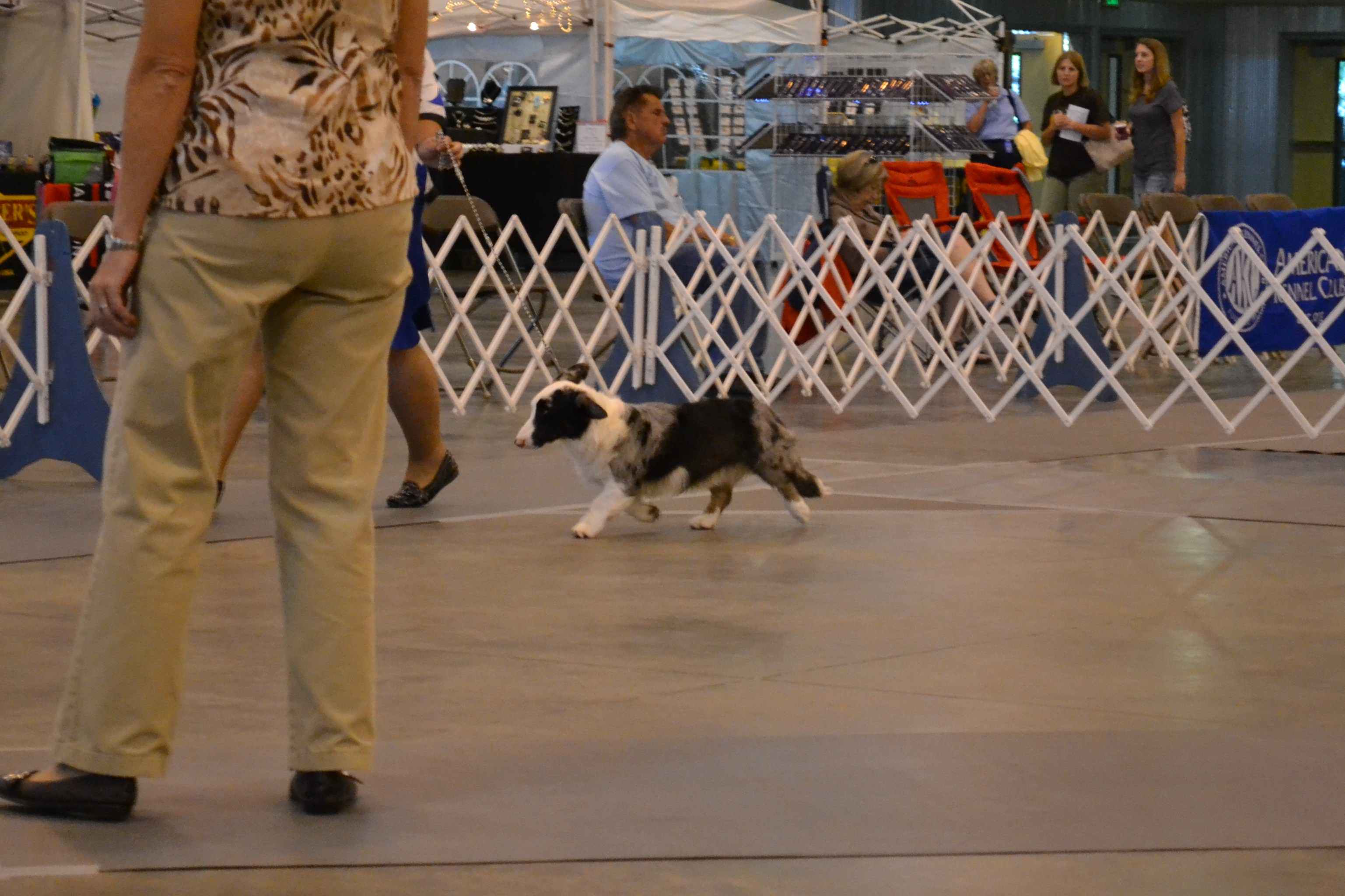 This past weekend was lil Widget’s first actual real show with me. She did so well 🙂 I really dont like showing puppies in the building at Greeley, as it can be a very loud and noisy place, and not always the best exposure for puppies. Cardis have shown outside in the past, but were scheduled inside this year (which is nice, especially when its 90+ degrees outside!!) Widget was WB/BOW for her first point under Judge Dana Cline on Saturday…and WB/BOW for two additional points under Judge Danelle Brown on Sunday. Both Judges loved Widget…and we would have to agree, we love her too!!