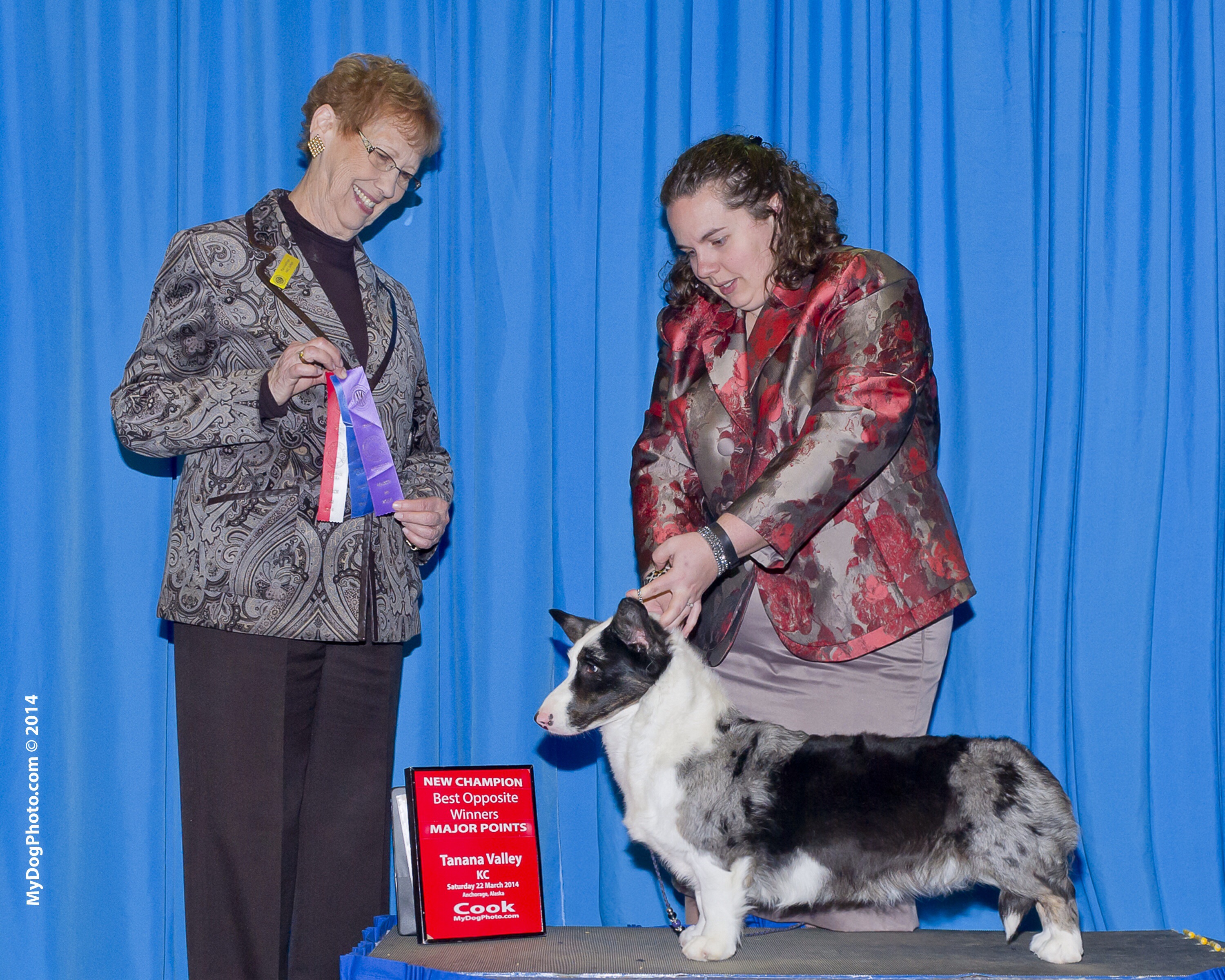 She finished with a 5 point major by going Best of Opposite Sex over the female specials last weekend. We moved her up for the second day of the show, and she was Select Butch for a 4 point Grand Champion major and a champions defeated win.