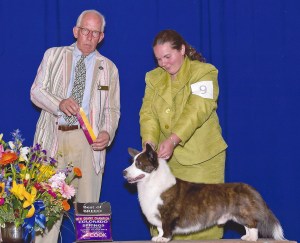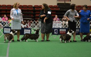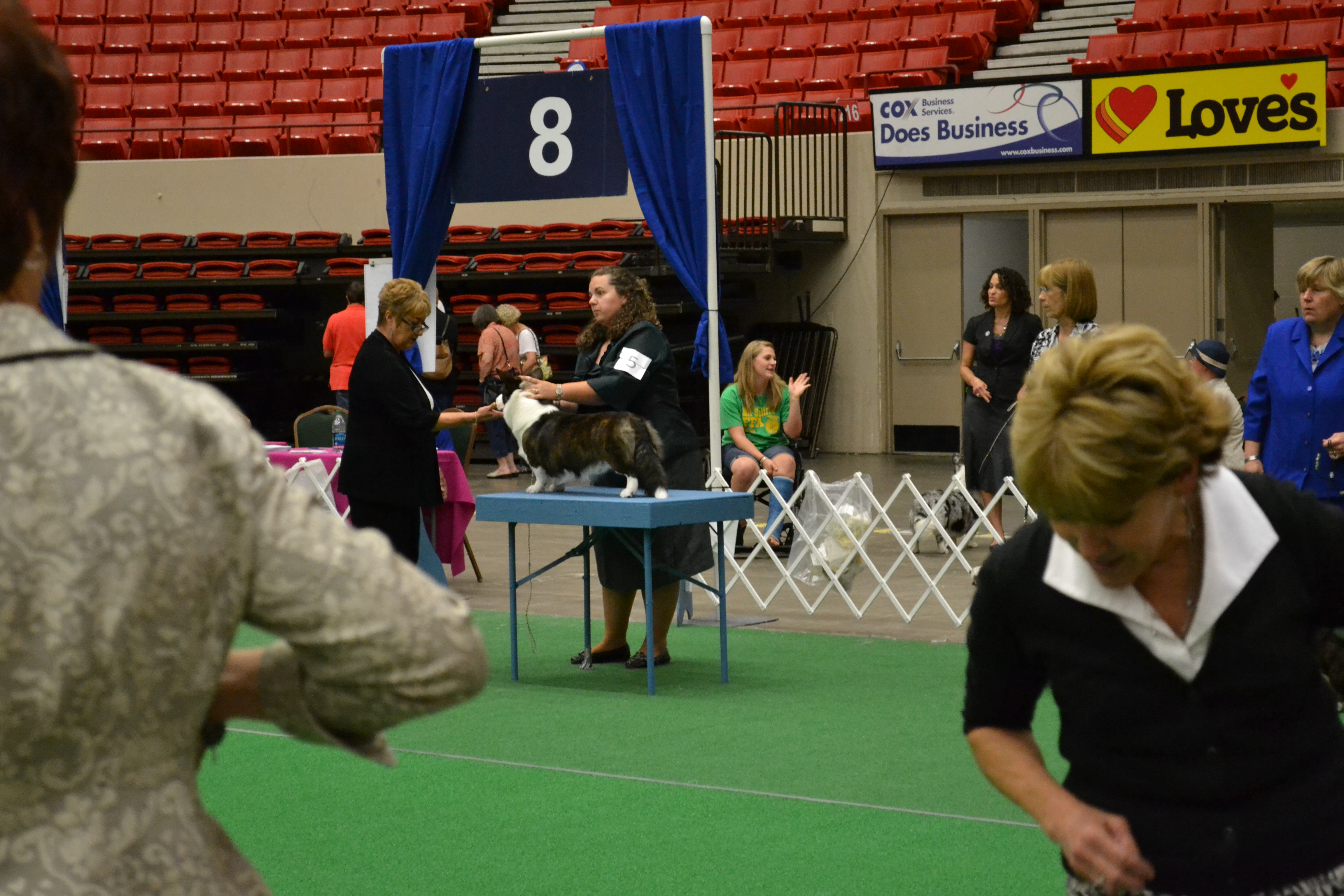 The following weekend was the local Colorado Springs shows. I had a different clients Cardigan Special and class bitch (Chase & Nola) and baby Puzzle. Puzzle was shown in the fun match on Friday night, and the judge awarded her the puppy Sporting group 1st. Nola was shown in the match as well and was awarded a Herding group 3rd. They were good girls ๐ At the actual show the following day, Nola was WB/BOS for another single point towards her Championship, and Chase was SD (no points since there was no class competition to boost the counts in boys). Puzzle was WB/BOS (again, no points available in Pointers…) ย On Sunday, I woke up not feeling well at all, so we missed Pointers….but made it to the show for Cardigans…Nola was again WB/BOS for another point, and this time Chase was BOB for the points he needed to finish his Grand Championship. He showed amazingly in the group, but got no love.
