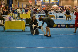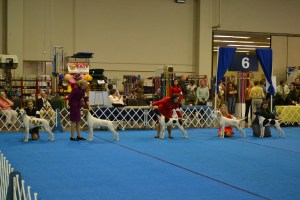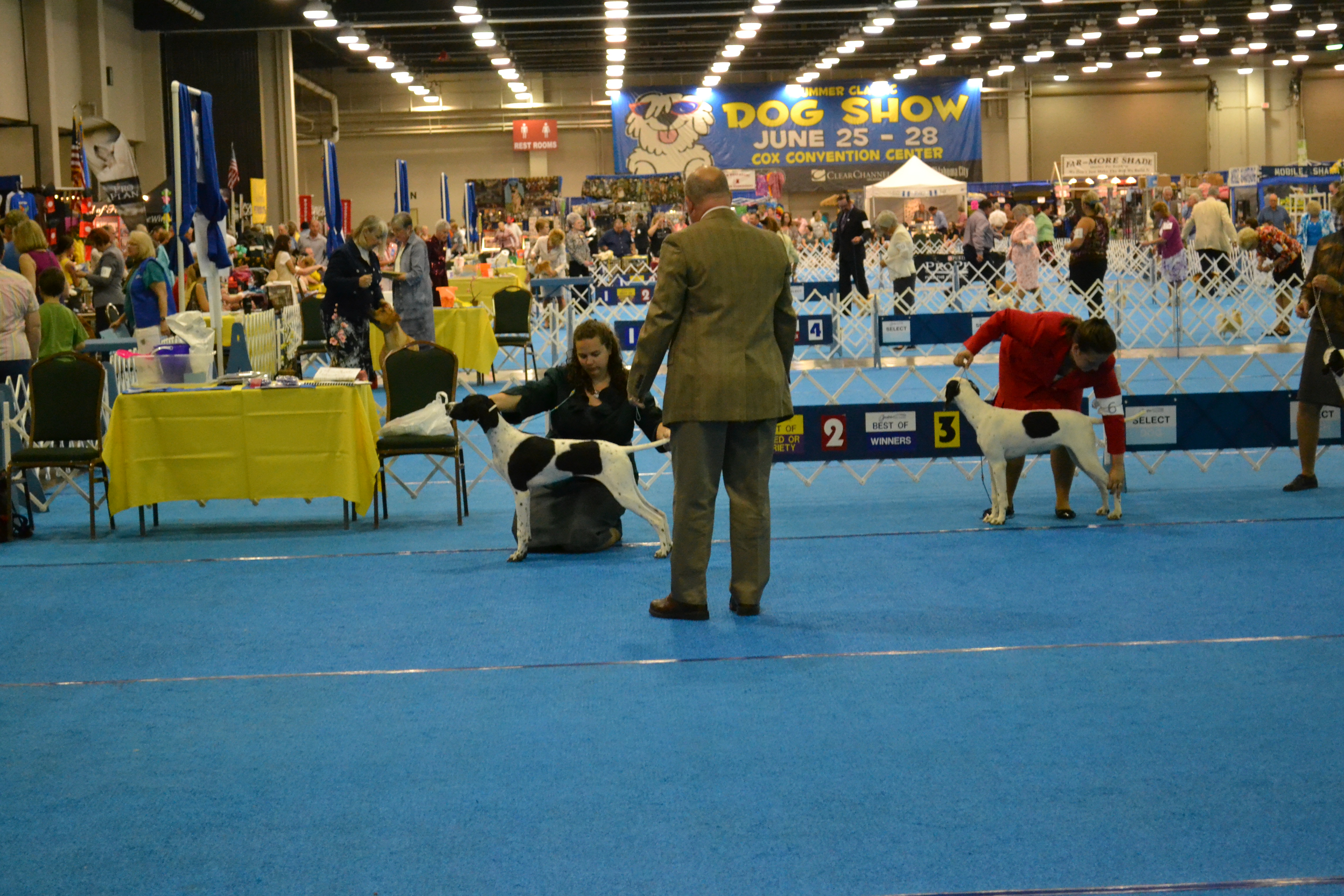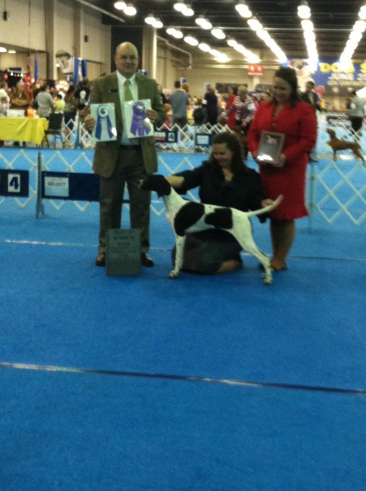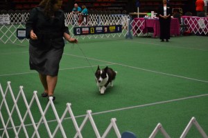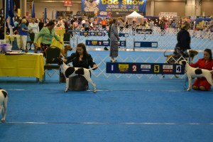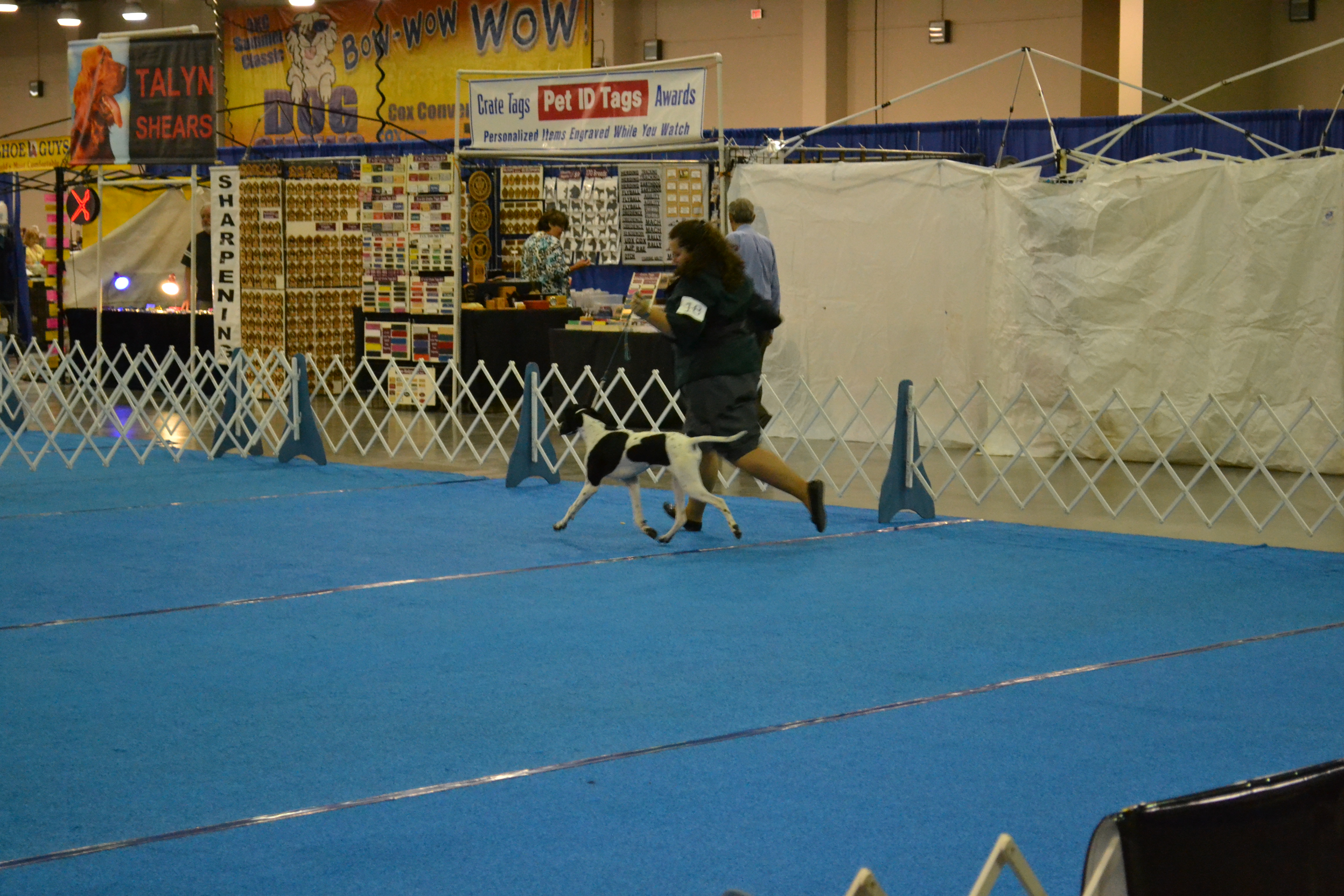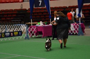 Puzzle won her 6-9 month class at the match as well. Sunday was probably the most stressful day, simply because as soon as we were done showing, we were hitting the road home…..packing up is always stressful for me when I know I need to do it quickly….Pointers were up first, and Puzzle, despite being completely freaked out by a dog barking loudly in a room that adjoined the show hall, managed to pull off 1st in her class, WB/BOW, picking up the major off the boys again (3 points). ย Nash showed well, but wasnt the judges type, and got the gate. In a ring that was 9+ Specials deep every day, I was proud of him for being in the ribbons 3 out of 4 days….